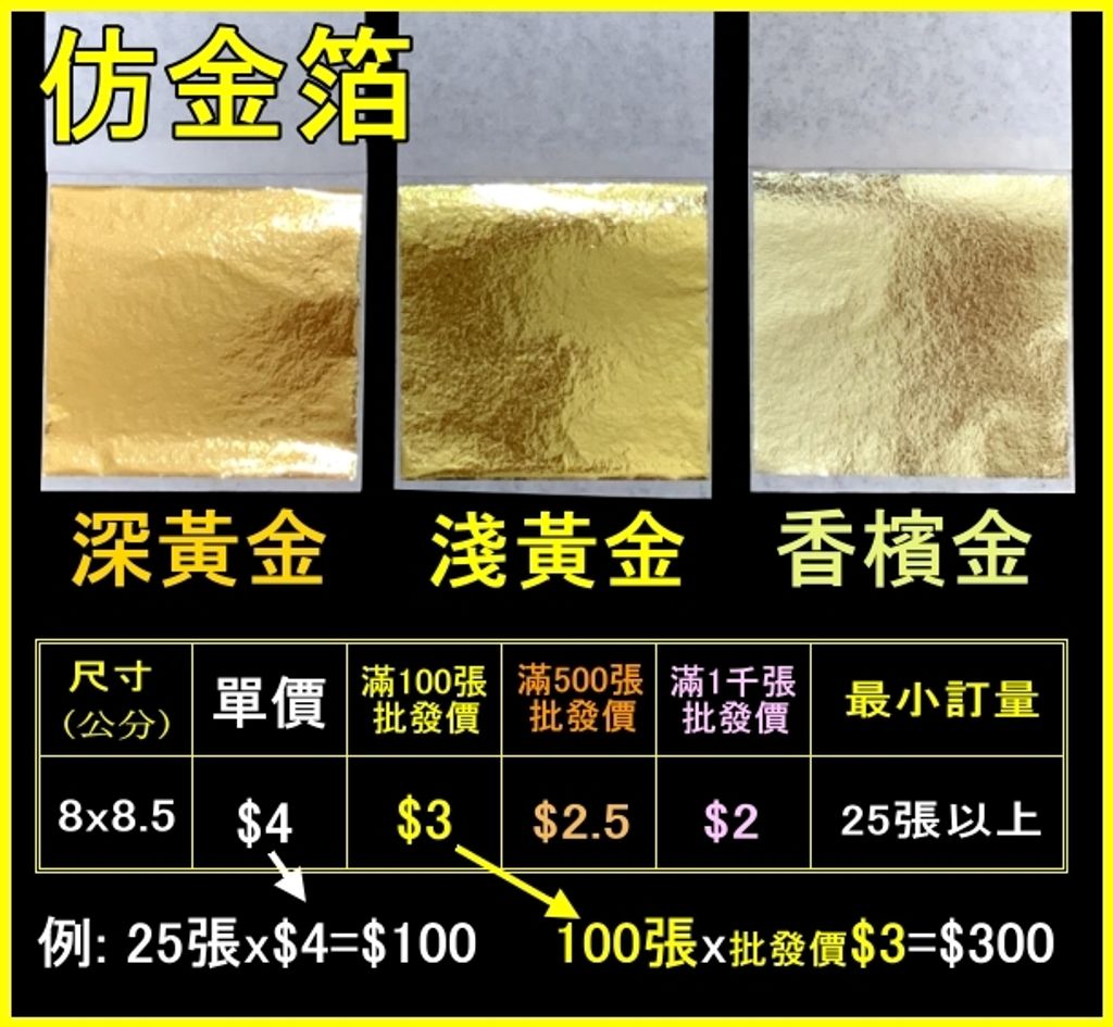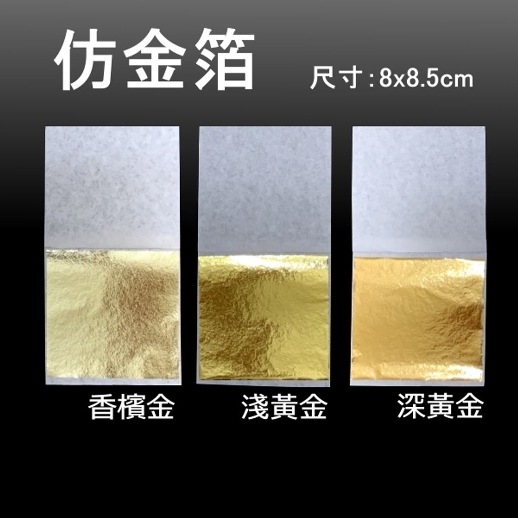 仿金箔可用在畫框、指甲彩繪、模型公仔、手工卡片...各式用途,仿金箔一樣是金色,但價格比金箔便宜很多,成本低可豪邁使用在想要貼金的物品🔰 仿金箔 特性 🔰1.無黃金成份。2.比金箔、銅箔更亮面。3.太陽曬久了會褪色。(建議最好用於室內)4.箔的厚度:金箔<銀箔<銅箔、鋁箔<仿金箔5.仿金箔較厚,有易碎的特性,儘量貼在平面的物品避免裂痕。
